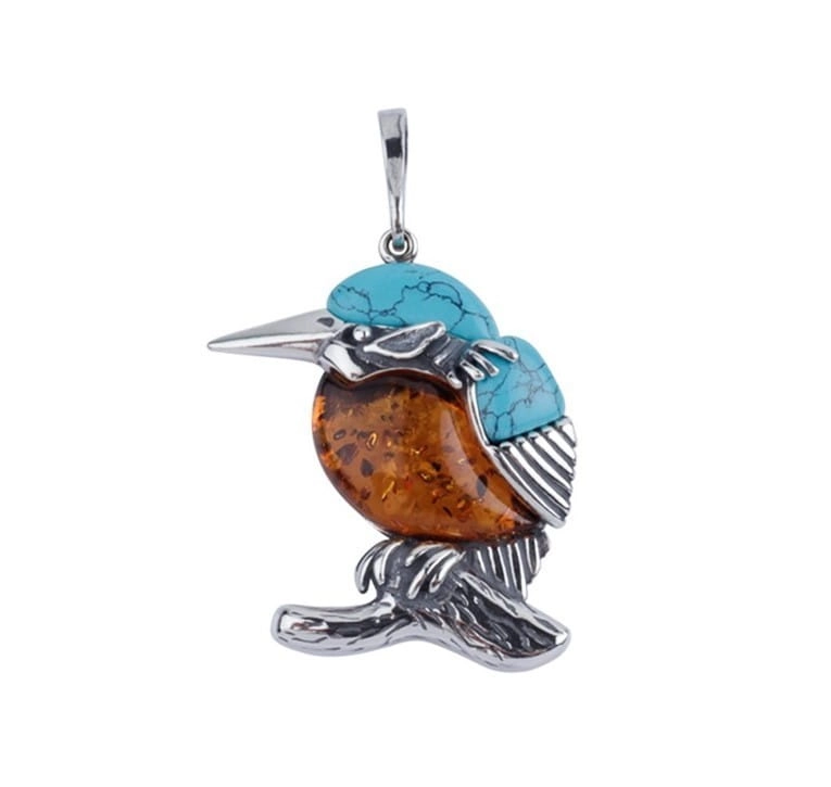 Silver Kingfisher pendant with amber
