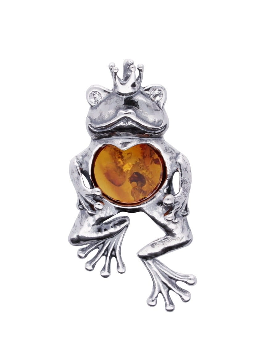 Silver frog pendant in a crown with amber