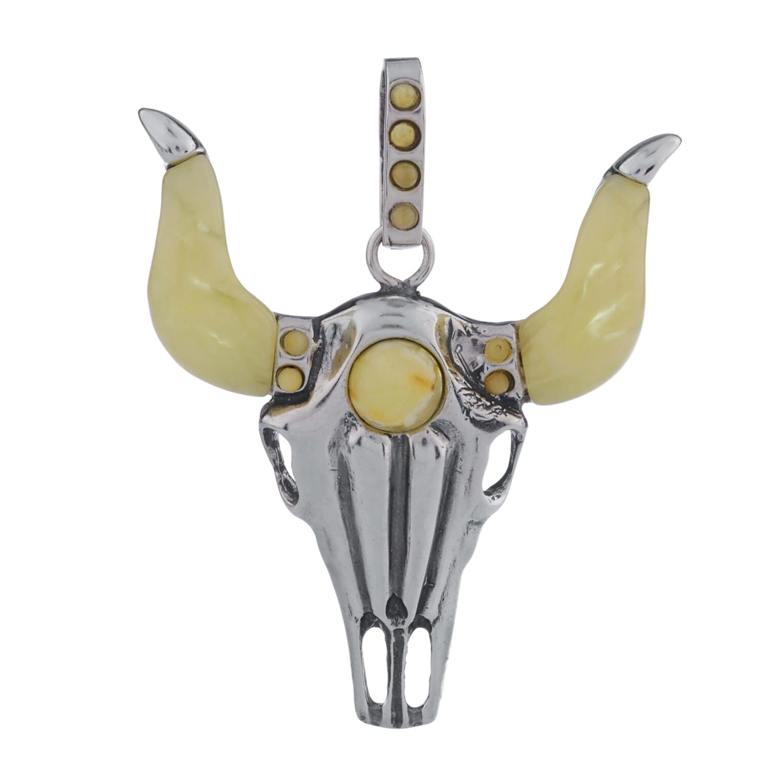 Silver pendant head bull with amber