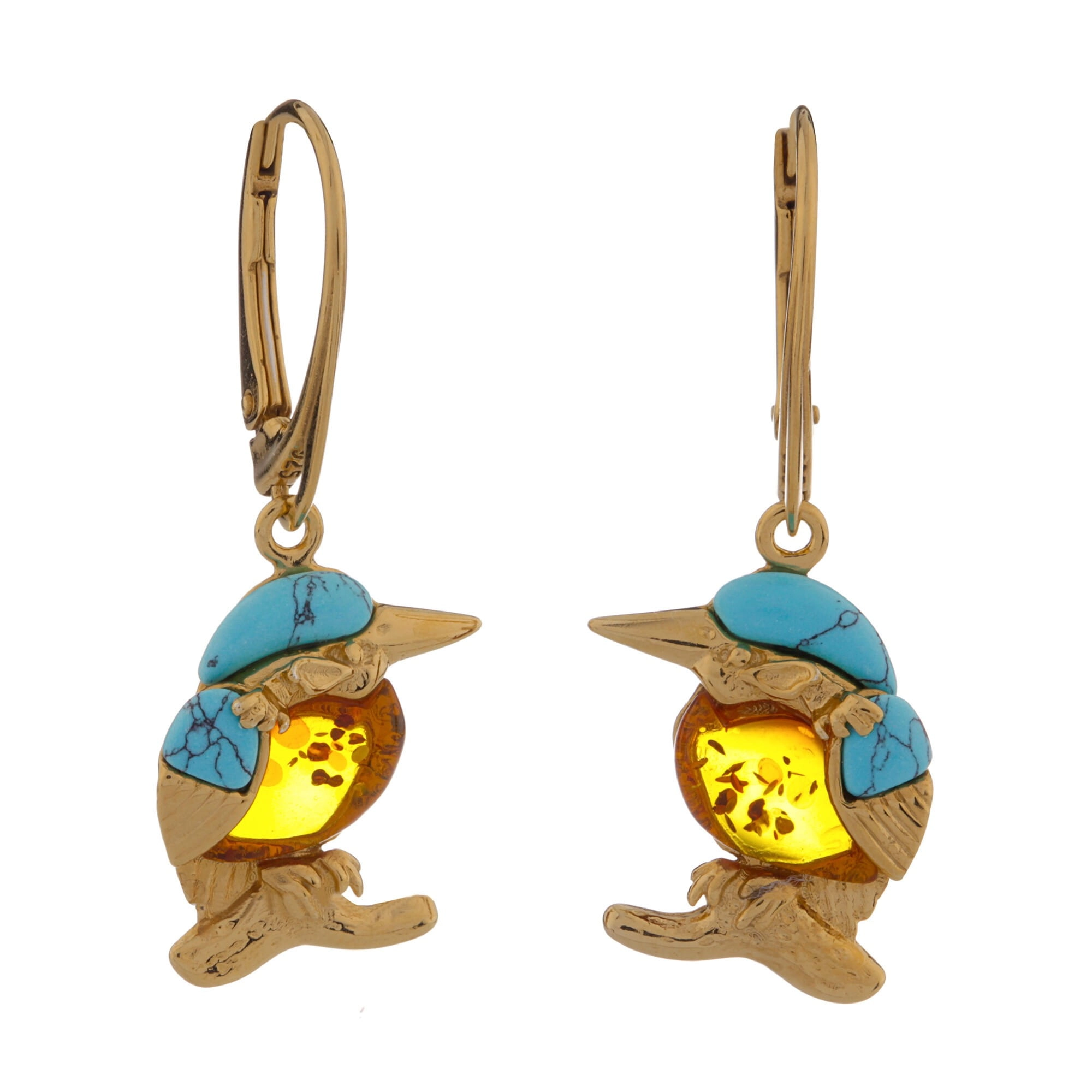 Srebrne pozłacane kolczyki zimorodki z bursztynem i turkusem 3,5 cm x 1,5 cm