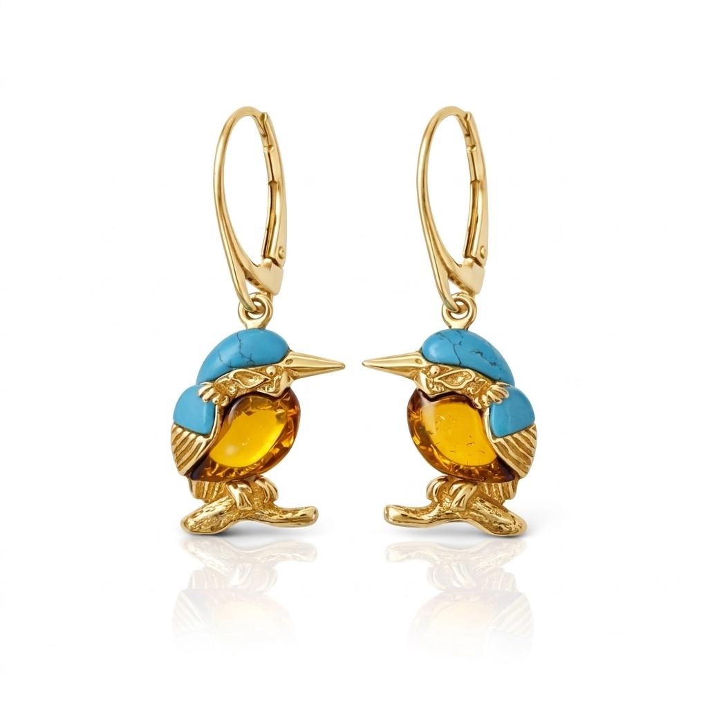 Te wyjątkowe srebrne pozłacane kolczyki w formie zimorodków zachwycają artystycznym połączeniem miodowego bursztynu bałtyckiego oraz błękitnego turkusu tworząc biżuterię pełną charakteru i wdzięku. Precyzyjne wykonanie detali ptaków w pozłacanym srebrze podkreśla unikalność produktu a praktyczne zapięcie typu bigiel zamknięty gwarantuje bezpieczeństwo i wygodę podczas codziennego użytkowania tej lekkiej ozdoby o wadze 3,8 g i wymiarach 3,5 cm na 1,5 cm.