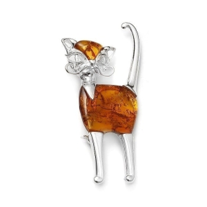 SREBRNA BROSZKA KOT Z BURSZTYNEM
