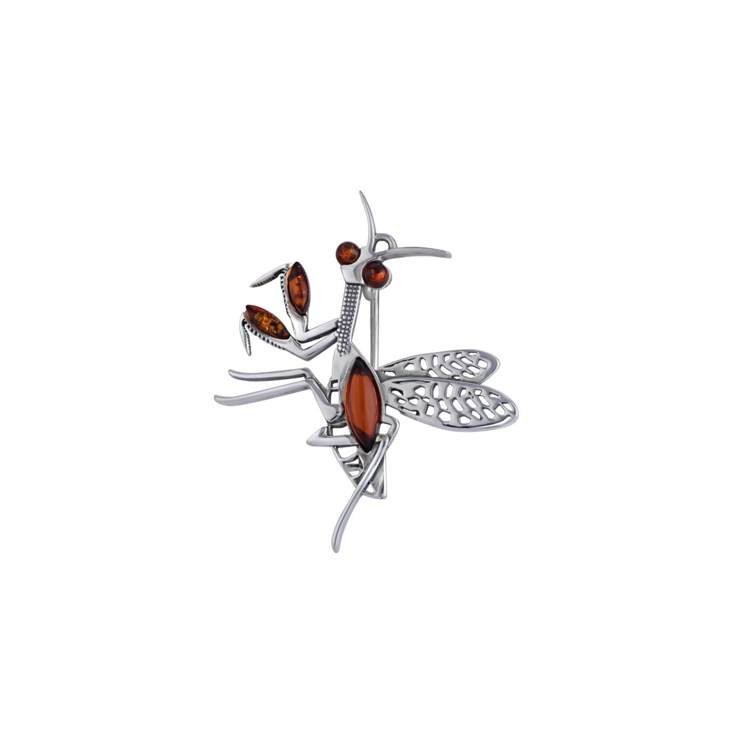 SREBRNA BROSZKA MODLISZKA Z BURSZTYNEM