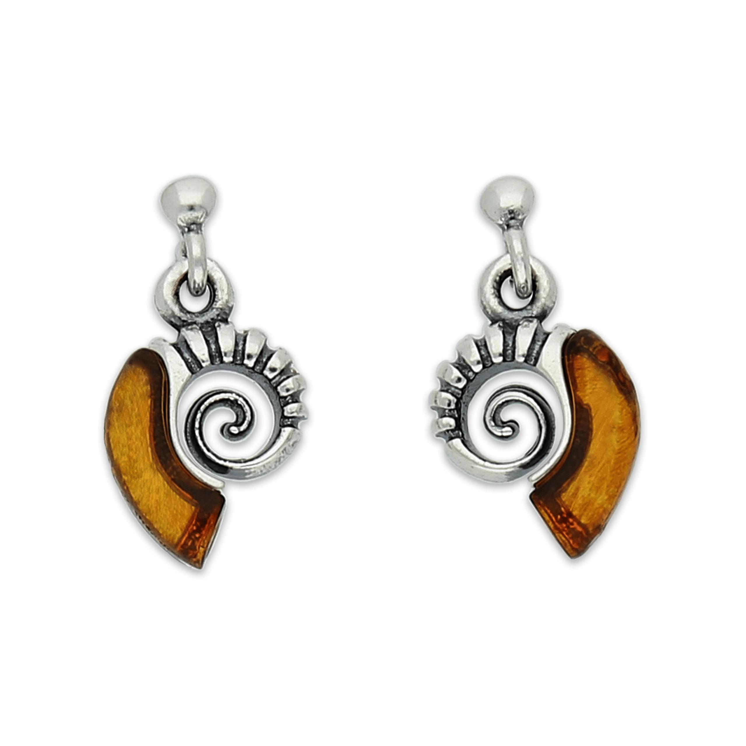 SREBRNE KOLCZYKI AMONITY Z BURSZTYNEM