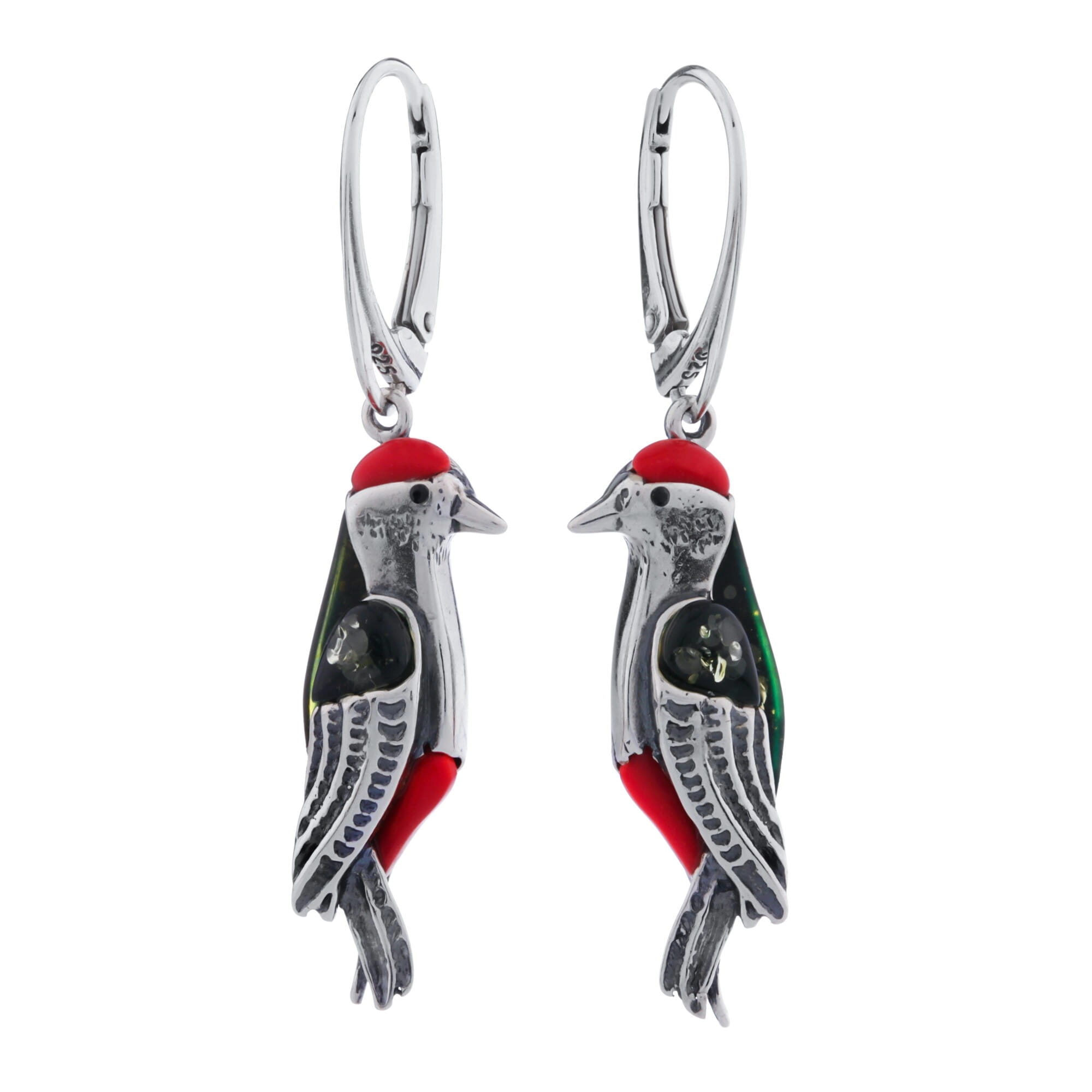 SREBRNE KOLCZYKI DZIĘCIOŁY Z BURSZTYNEM