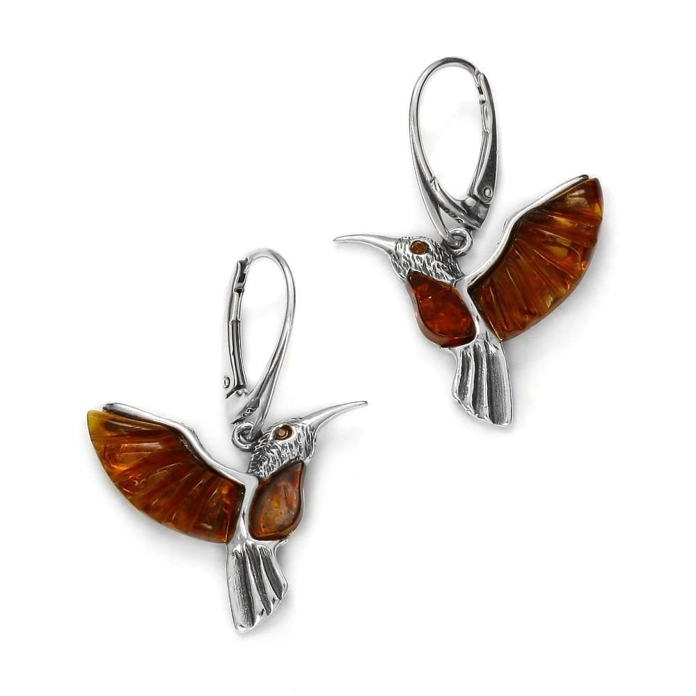 SREBRNE KOLCZYKI KOLIBRY Z BURSZTYNEM