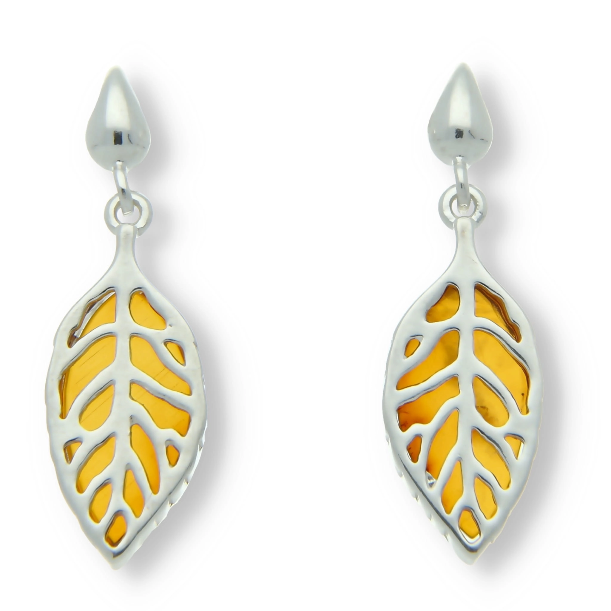 SREBRNE KOLCZYKI LISTKI Z BURSZTYNEM
