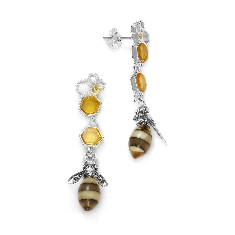 SREBRNE KOLCZYKI PSZCZOŁA NA PLASTRZE MIODU Z BURSZTYNEM