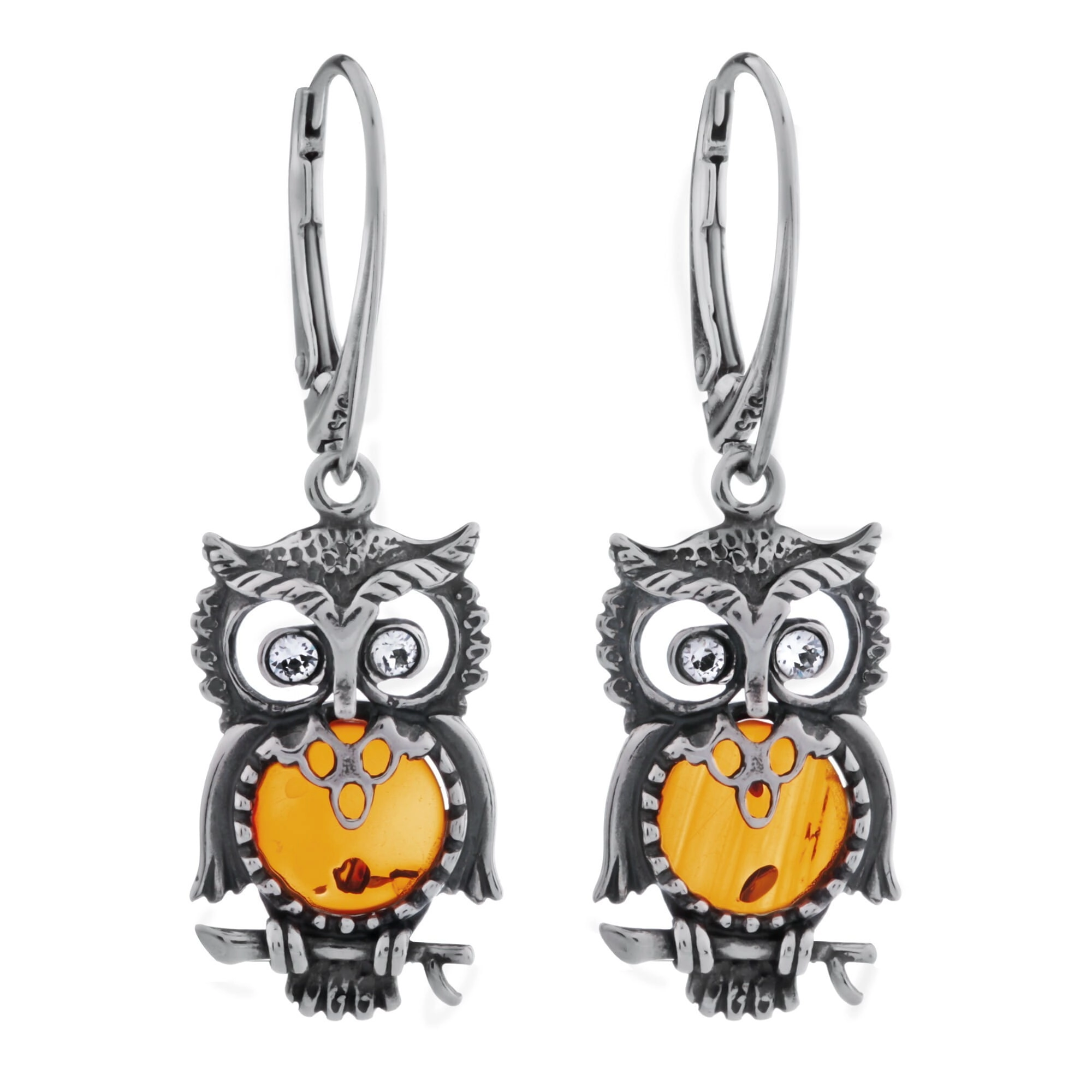 SREBRNE KOLCZYKI SÓWKI Z BURSZTYNEM