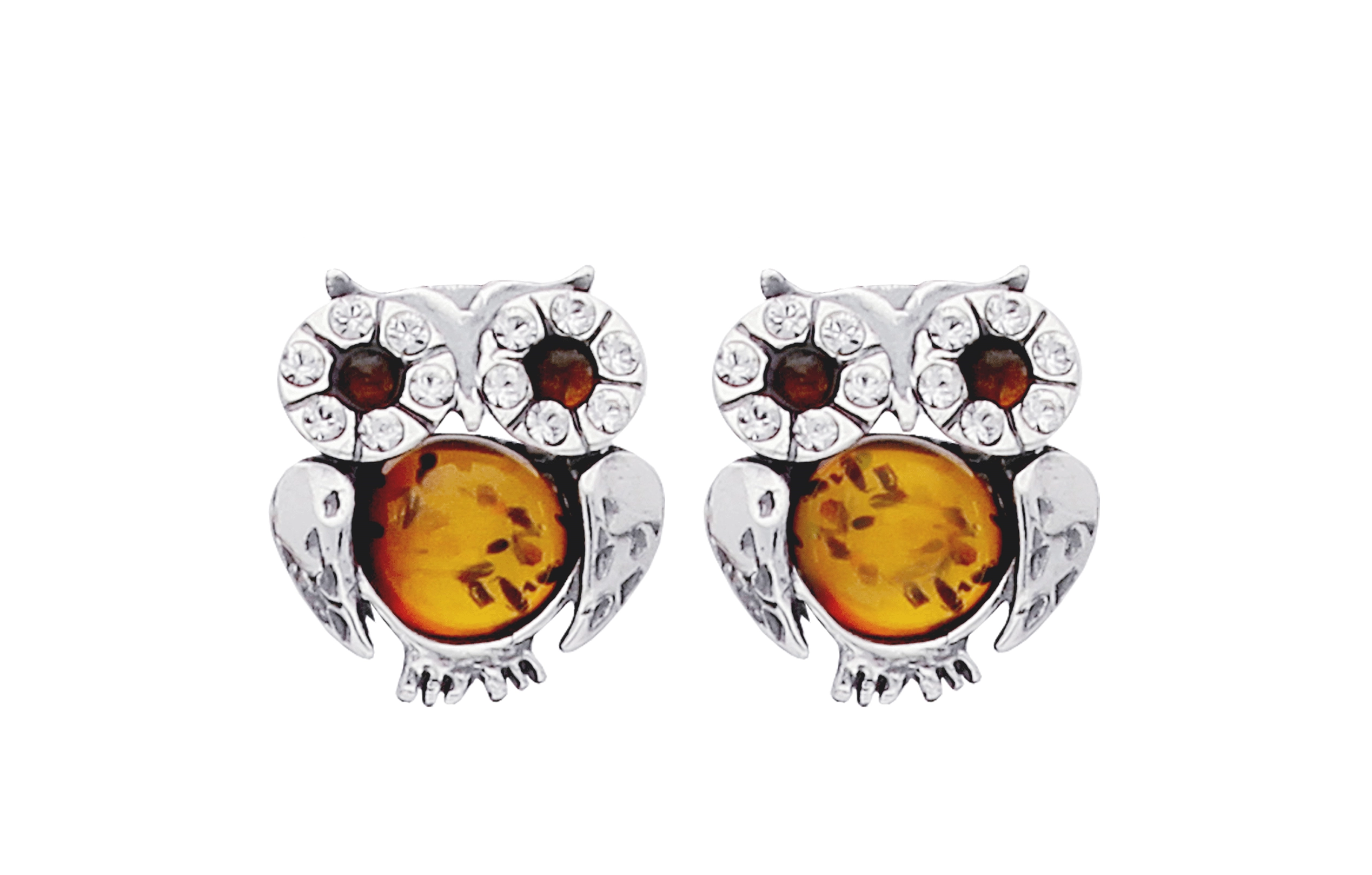 SREBRNE KOLCZYKI SÓWKI Z BURSZTYNEM
