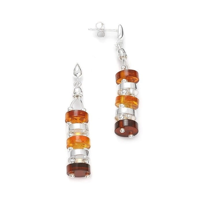 Gustowne kolczyki z bursztynem, których unikalne wzornictwo przyciąga uwagę i cieszy oczy. Złoto bałtyku przybiera wiele kolorów dzięki czemu biżuteria pasuje do każdej Pani podkreślając jej wyjątkowość.