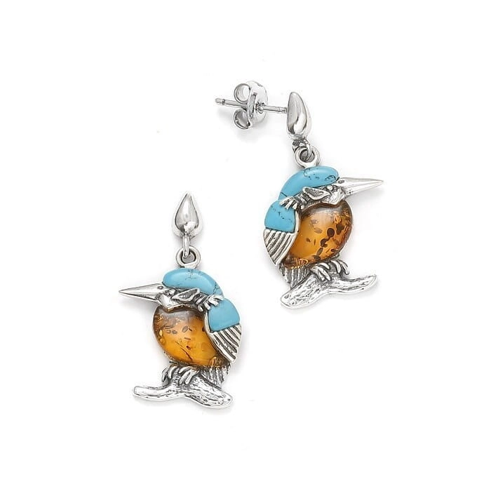 SREBRNE KOLCZYKI ZIMORODKI Z BURSZTYNEM