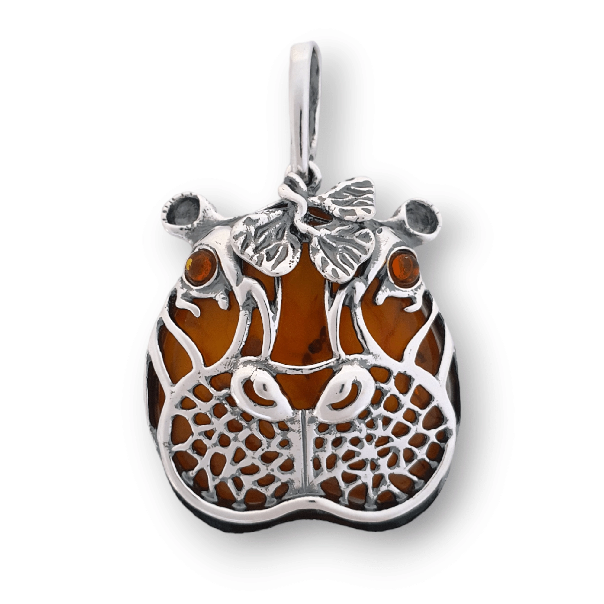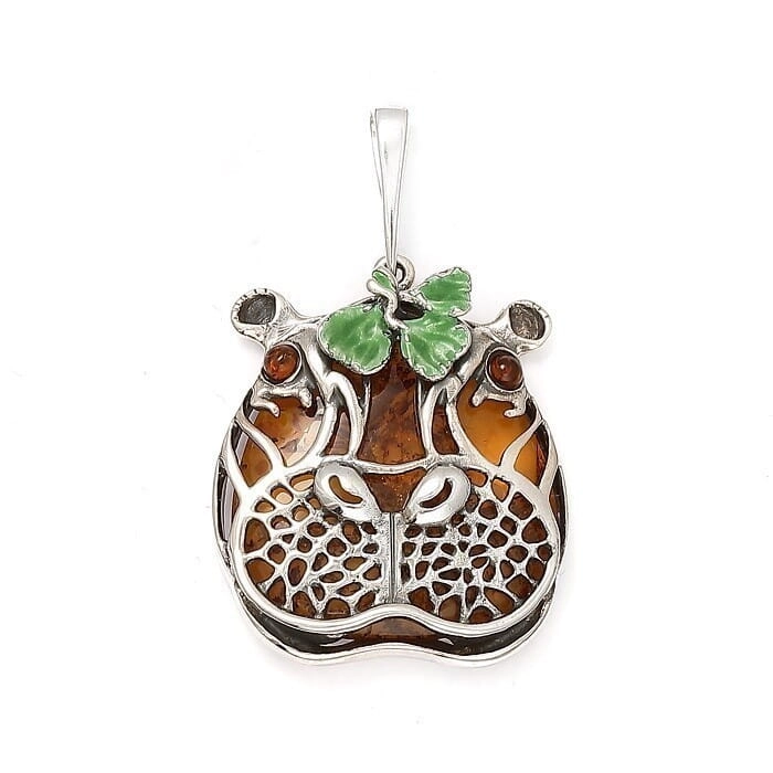 SREBRNY WISIOR HIPOPOTAM Z BURSZTYNEM