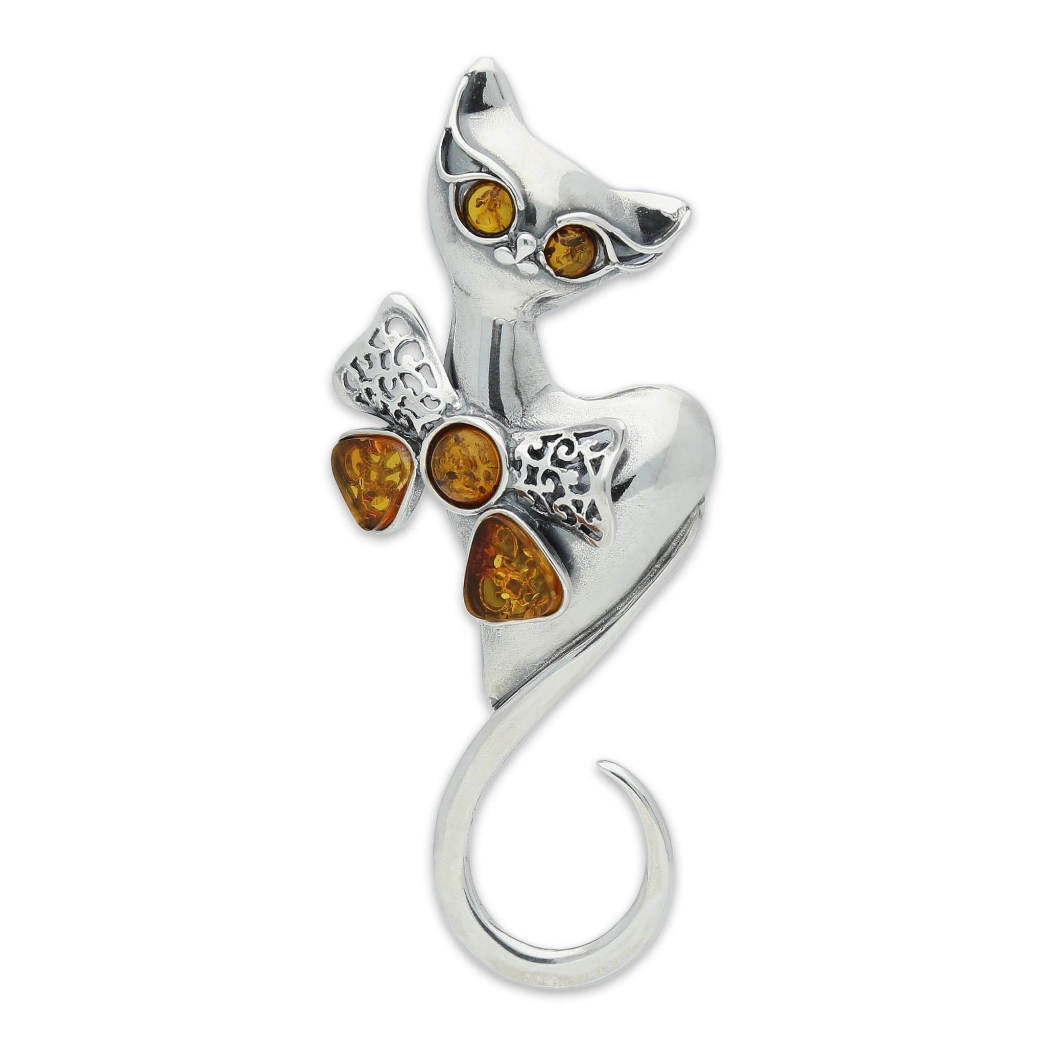 SREBRNY WISIOR KOT Z KOKARDĄ Z BURSZTYNEM