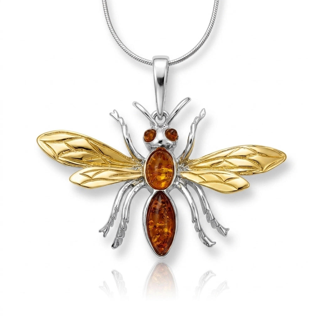 Centralną część kompozycji zdobią bursztynowe elementy w ciepłych, miodowych odcieniach, które pięknie odbijają światło i przyciągają uwagę. Starannie dopracowane detale podkreślają dekoracyjność biżuterii i jej unikalny styl.