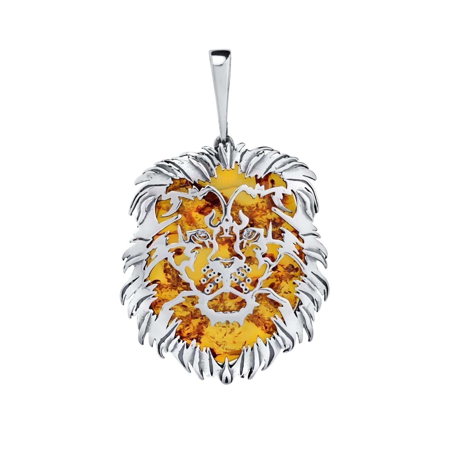 SREBRNY WISIOREK GŁOWA LWA Z BURSZTYNEM