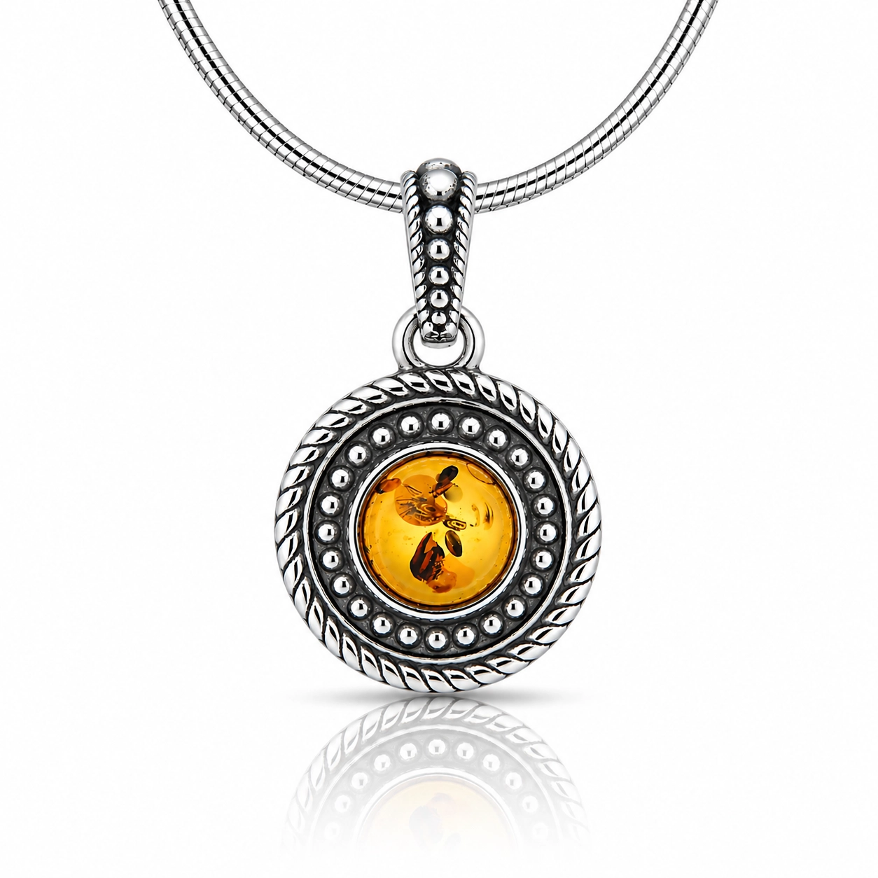 Elegancki srebrny wisiorek w formie klasycznego koła to ponadczasowa propozycja dla miłośników subtelnej, ale wyrazistej biżuterii. Centralnie osadzony bursztyn przyciąga uwagę swoją ciepłą barwą i naturalnymi inkluzjami, które czynią każdy egzemplarz wyjątkowym. Ozdobna oprawa z drobnymi detalami dodaje całości szlachetnego charakteru.