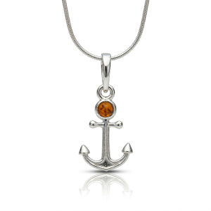 Stylowy wisiorek wykonany ze srebra w kształcie klasycznej kotwicy – symbolu stabilności, nadziei i bezpieczeństwa. Prosta, ponadczasowa forma została wzbogacona o bursztynowy akcent w ciepłym, miodowym odcieniu, który dodaje całości subtelnej elegancji.