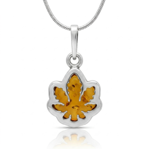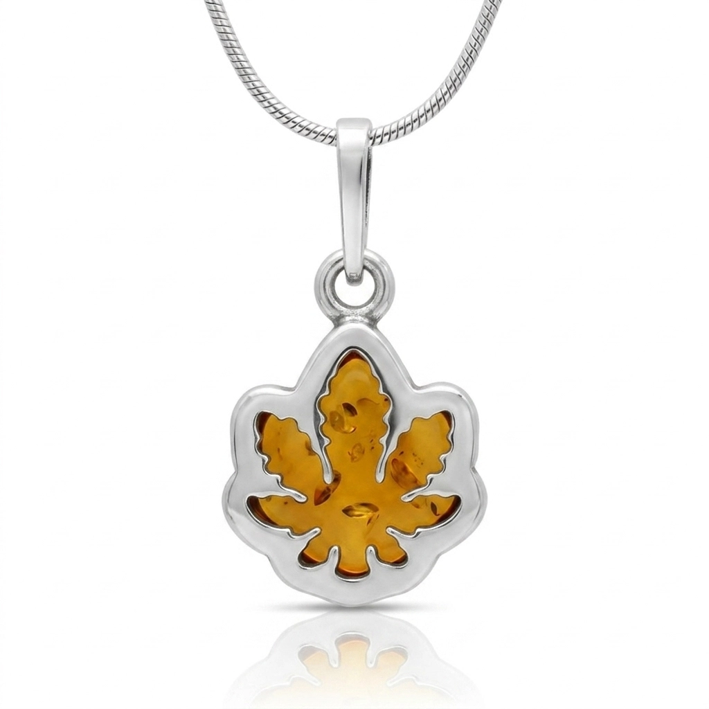 Wnętrze liścia wypełnia bursztyn w ciepłym, miodowym odcieniu, który pięknie kontrastuje z chłodnym połyskiem srebra i przyciąga wzrok swoją głębią. Prosta, a zarazem dekoracyjna forma sprawia, że wisiorek doskonale sprawdzi się jako subtelny dodatek na co dzień.