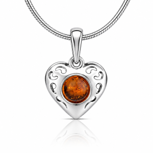 Ażurowe zdobienia na powierzchni serduszka dodają lekkości i finezji, podkreślając delikatny charakter zawieszki. Gładko wykończone srebro pięknie kontrastuje z bursztynem, tworząc harmonijną i stylową kompozycję.